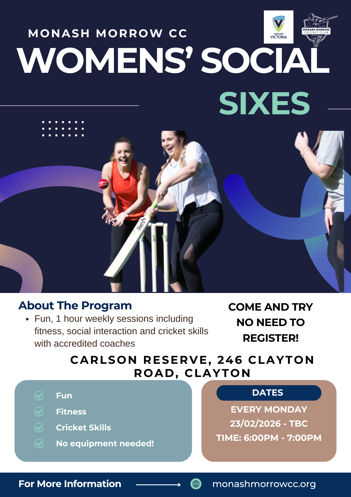 • A low-cost Cricket Victoria program designed to boost women’s participation through fun, fitness-focused soft-ball sessions (around 1 hour), building fundamental skills with flexible scheduling and the option to progress into social matches.